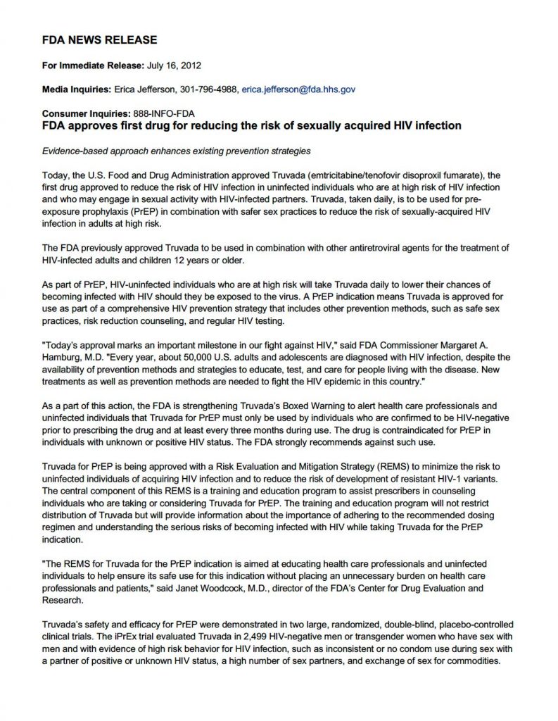 FDA New Release PrEP 16 July 2012
